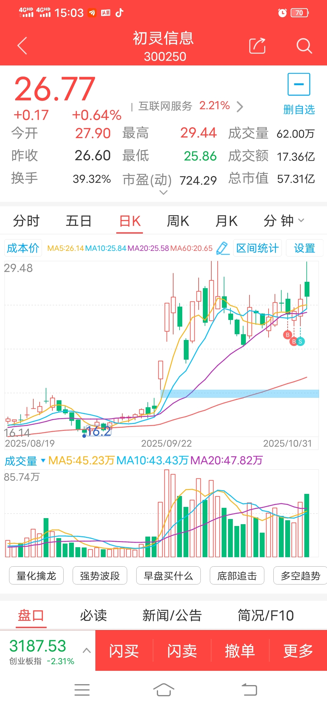 $初灵信息(SZ300250)$ 昨天卖了,上午还在后诲,到收盘心里平衡了,比我的卖价还低哈哈