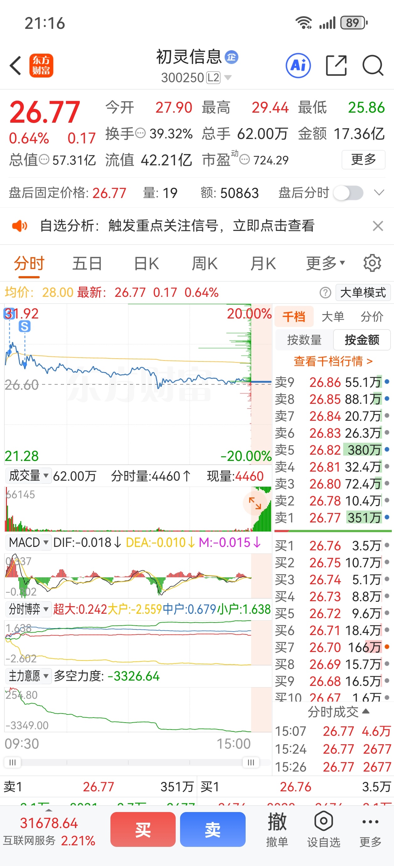 $初灵信息(SZ300250)$ 昨天收盘价进的,今天格局到5个点出来了,留下来的发财