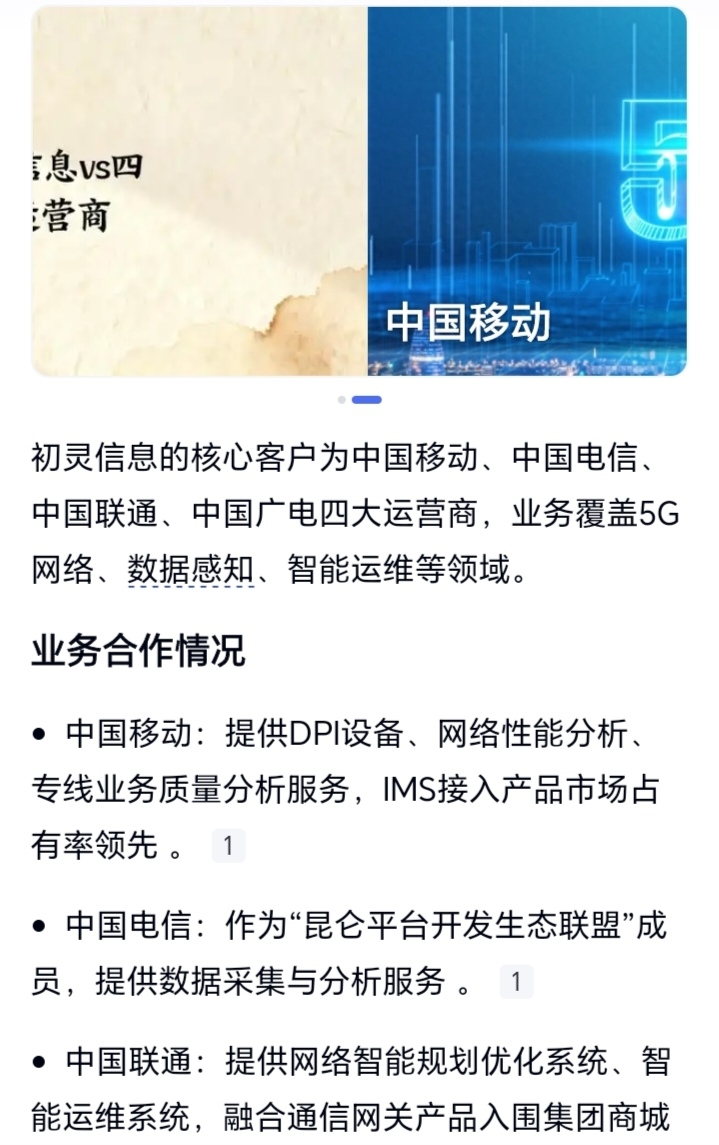 初灵信息的核心客户为中国移动、中国电信、中国联通、中国广电四大运营商,业务覆盖5G网络、数据感知、智能运维等领域。
