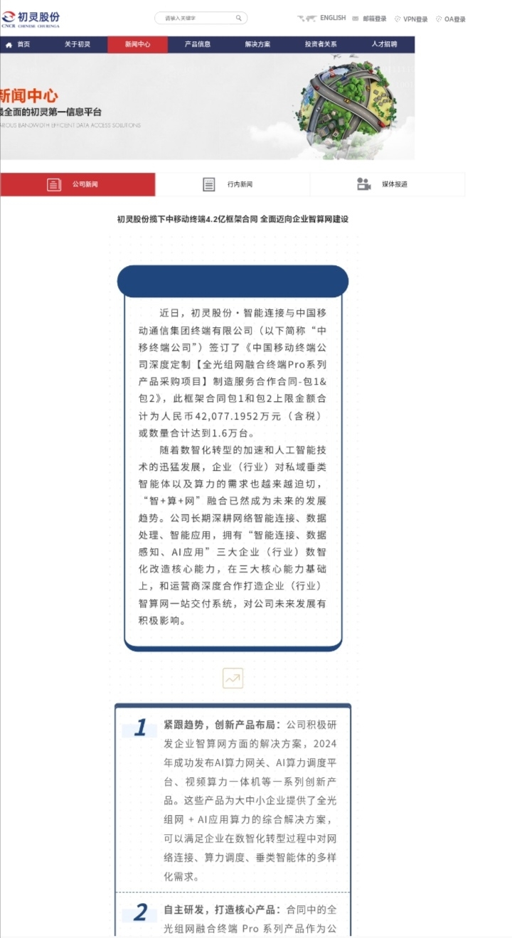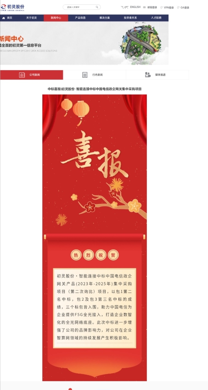 喜报!初灵股份揽下中移动终端4.2亿框架合同后,近期再次中标中国电信政企网关集中