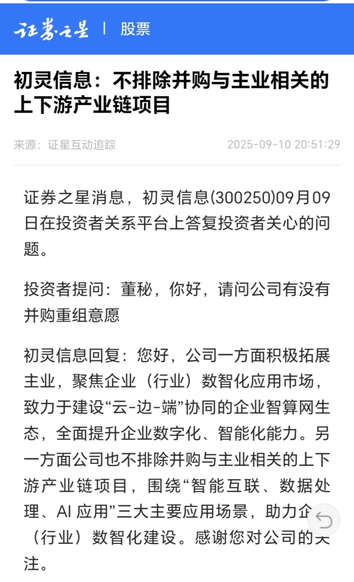 初灵信息:不排除并购与主业相关的上下游产业链项目。