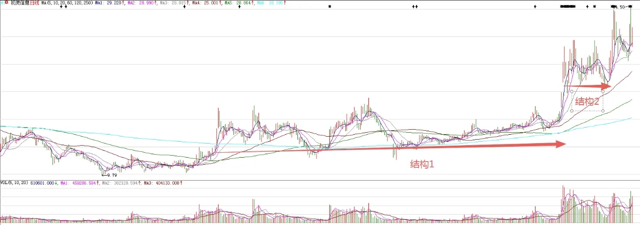 周末分析中,指出了今天企稳回升。今天走势了小阳线,释放了企稳信号。只是明天盘中大概率还有小幅度震荡调整,这是插曲。近期的震荡,构成了新的潜在结构,作为图中标注的结构2突破后的回踩。图中标注大型结构1突破,意味着股价处在比较大的上涨趋势。结构2是结构1突破后的回踩,意味着波段上涨拉开帷幕。今天的上涨,基本确认了结构2突破后回踩结束,新的波段上涨大概率要开始了。