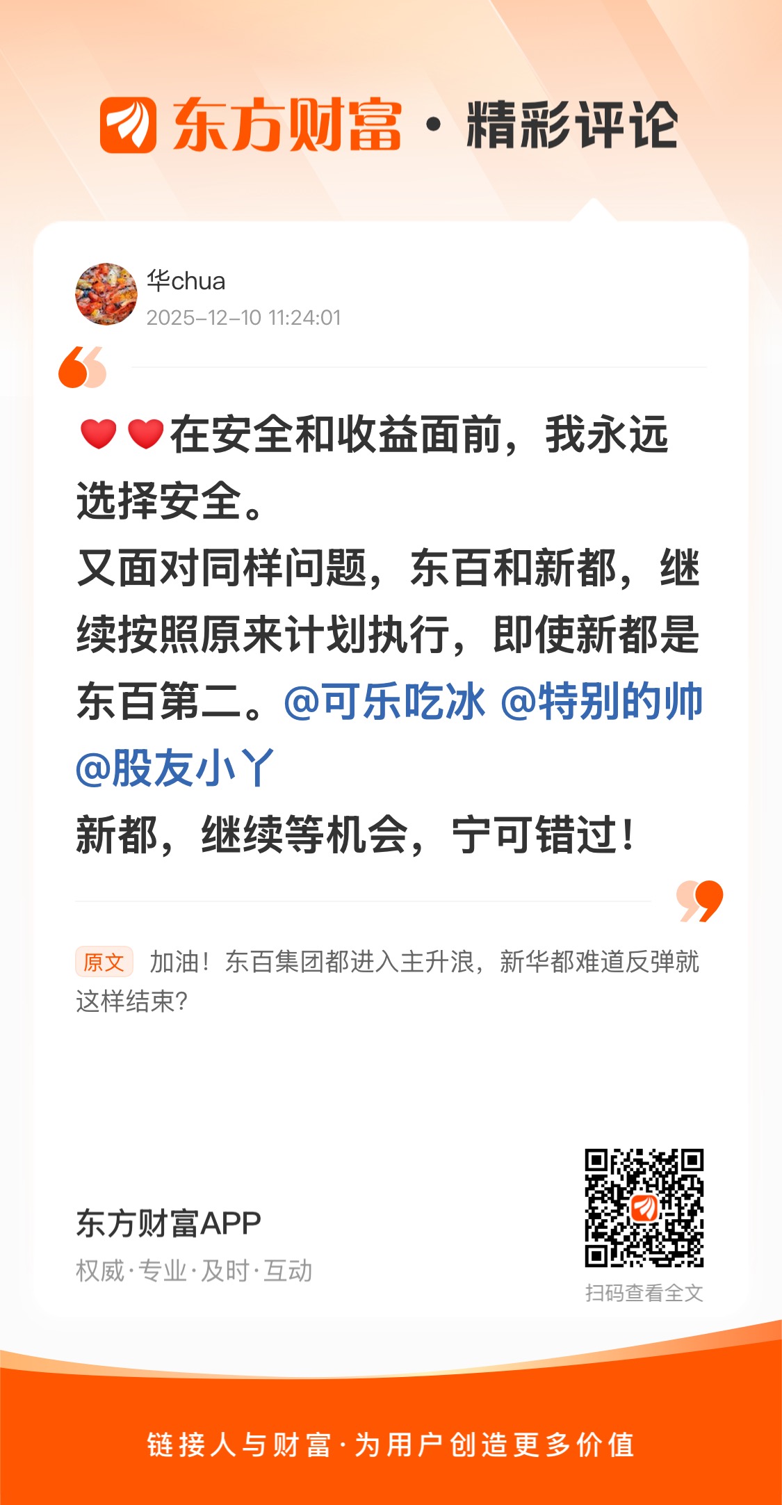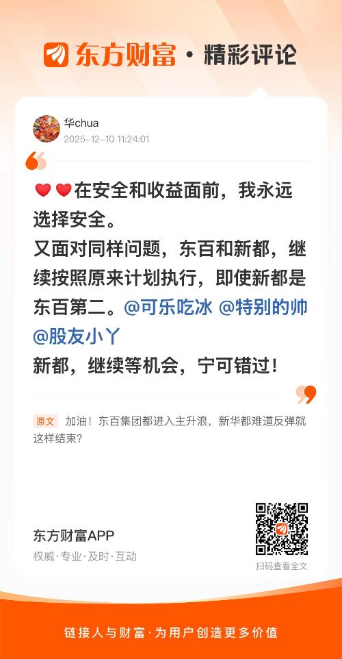 在安全和收益面前,我永远选择安全。又面对同样问题,东百和新都,继续按照原来计划执行,即使新都是东百第二。@可乐吃冰 @特别的帅 @股友小丫 新都,继续等机会,宁可错过!