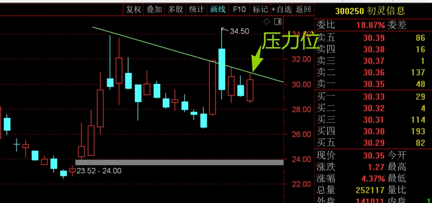 $初灵信息(SZ300250)$ 上周冲高后,本周主要是回落调整,短线来看,主要观察头上趋势线的压力,能带量突破就好看了,继续震荡看涨,但冲高回落就要防着突破不了,需要回调的风险,这几天的低位作为防守位置看待,有点跌破需要控制仓位应对。
