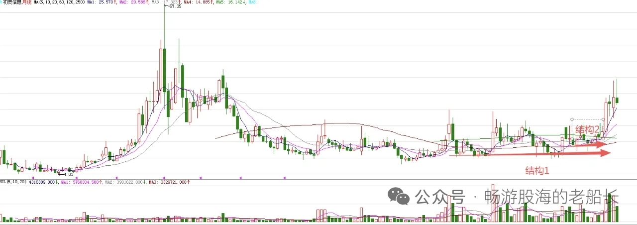 月级别走势来看,存在超大型的结构1和中型规模的结构2.结构1是根源性结构,结构2是结构1的延伸,是结构1的组成部分。这两个结构,主要为了修复该级别的六十单位均线,突破意味着股价处在大型的上涨趋势。两个结构突破后,股价震荡到了第三个月,不过,目前两条均线已经得到了实质性修复,所以波段上涨随时会继续。
