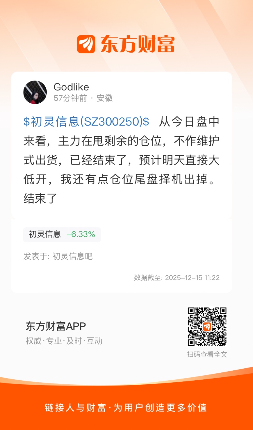 $初灵信息(SZ300250)$ 从今日盘中来看,主力在甩剩余的仓位,不作维护式出货,已经结束了,预计明天直接大低开,我还有点仓位尾盘择机出掉。 结束了