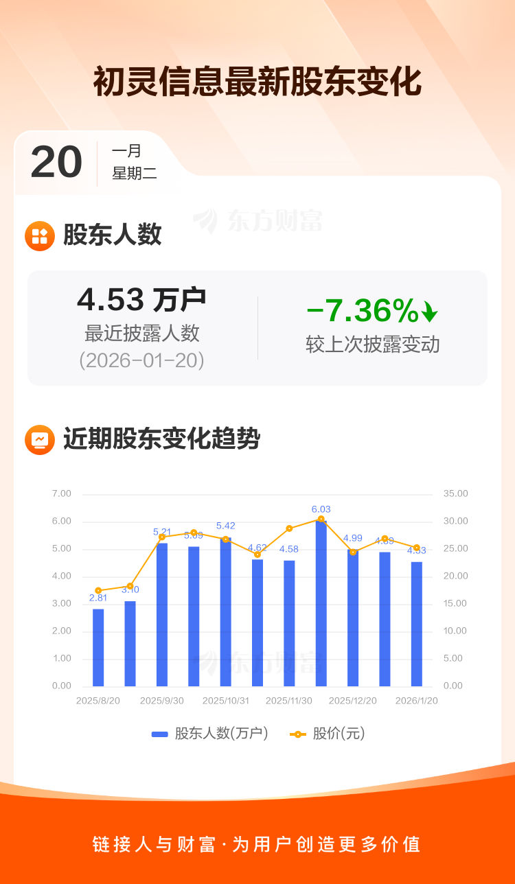 初灵信息:截至1月20日最新股东户数4.53万户,较上期减少7.36%