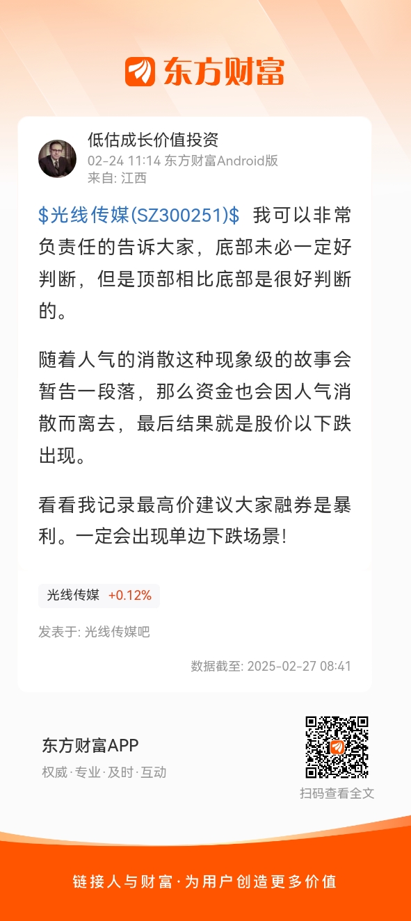 $光线传媒(SZ300251)$ 我可以非常负责任的告诉大家,底部未必一定好判断,但是顶部相比底部是很好判断的。