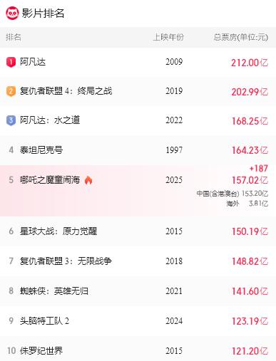 4月22日,据网络平台数据,全球影史票房榜第5名的电影《哪吒之魔童闹海》总票房已破157亿元。