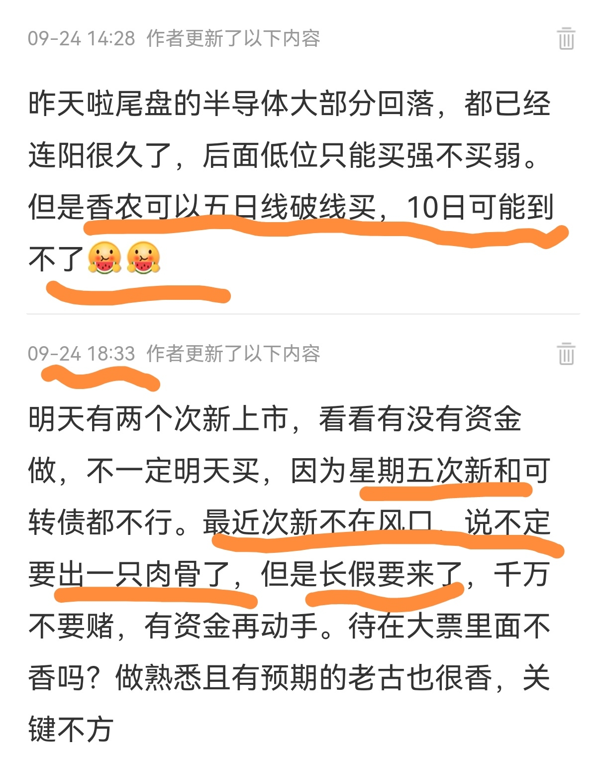 次新:前几天就看好且只看好建发,昨天尾盘介入今天坐T减仓了,逻辑预判今天验证,意料之中也没有多大悬恋。这两年个人次新战绩可查,第二天大跌的恩威药业,中科环保,天元只能,无线传媒等都有介入,今年c2介入的华之杰,除C后的新恒辉,还有广东建科等,印象中国庆失败案例鸿日达,专门开贴和一个老登对骂买次新都是以小博大,风险和机遇并存