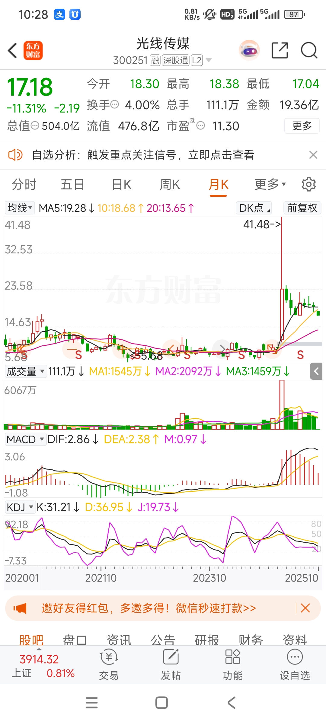 $光线传媒(SZ300251)$ 看月K线,这个股盘三五年是家常便饭,开张吃三年。但是如果你陷在里面,这个牛市就是跟你无关,最后可能就守个解套,值得吗?
