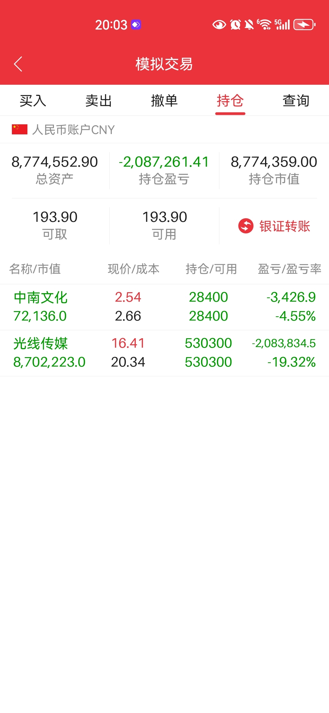 $光线传媒(SZ300251)$ 幸运的是模拟盘,不然真要跳海喂鱼了