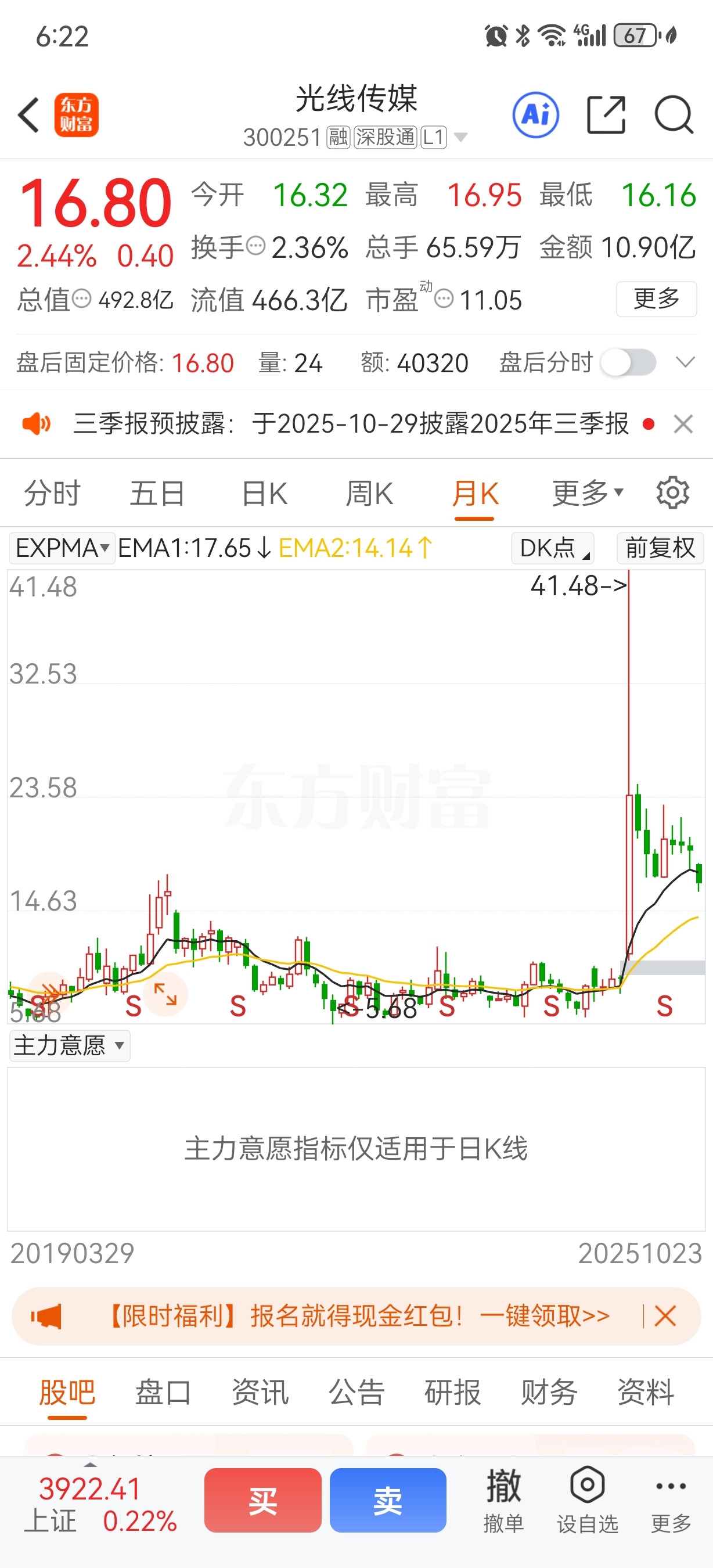 从光线传媒的月线看,王长田就是最大的空头。自己做空自己的公司:股价一泄不振的情况下,公告大股东减持!