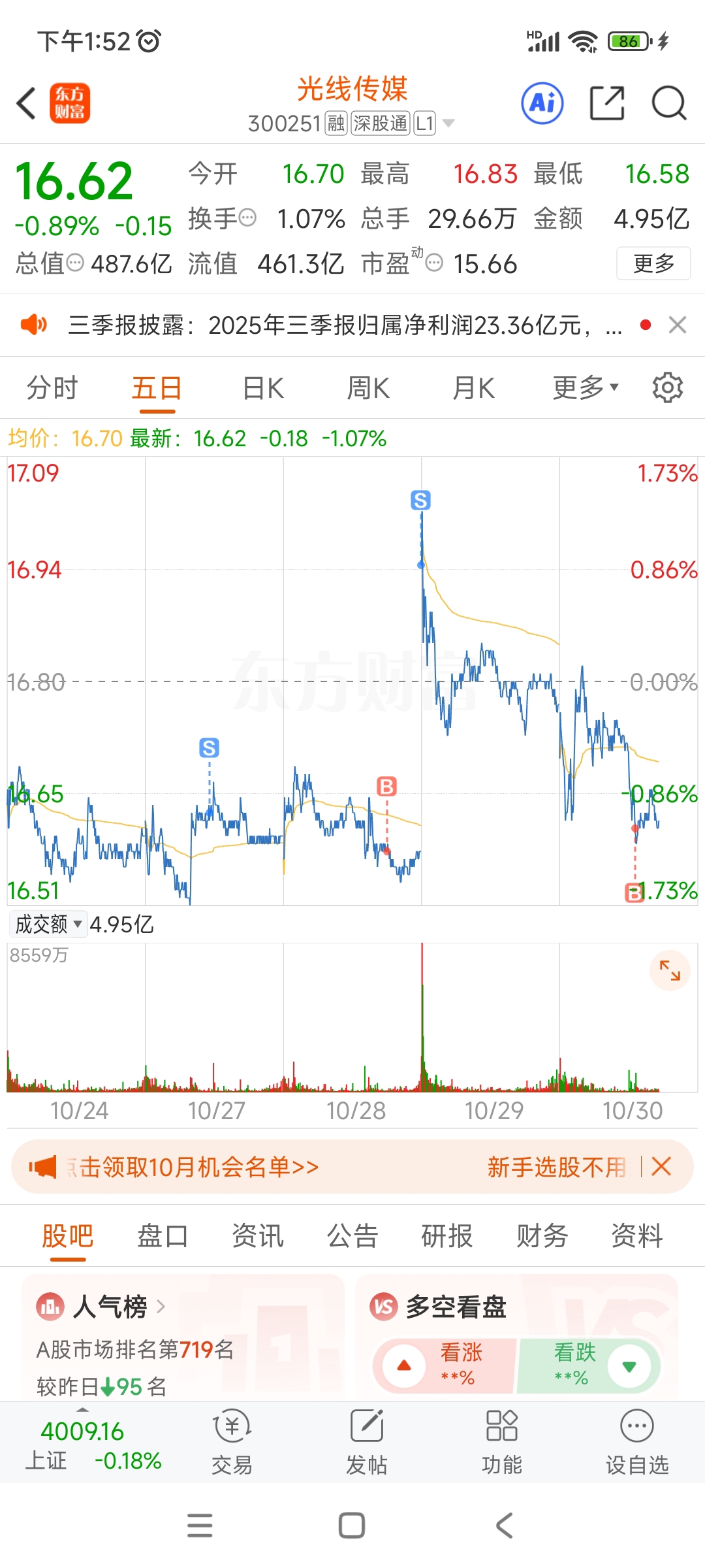 $光线传媒(SZ300251)$ 兄弟们,星尘昨天看开盘集合竞价不及预期,直接16.95走了,感谢庄稼老爷今天砸盘,16.61接回来了,踢了主力的屁股,现在成本20.68,谢谢你八辈祖宗