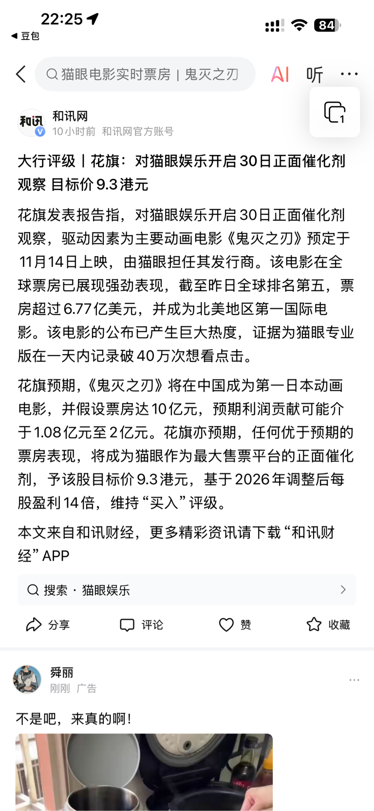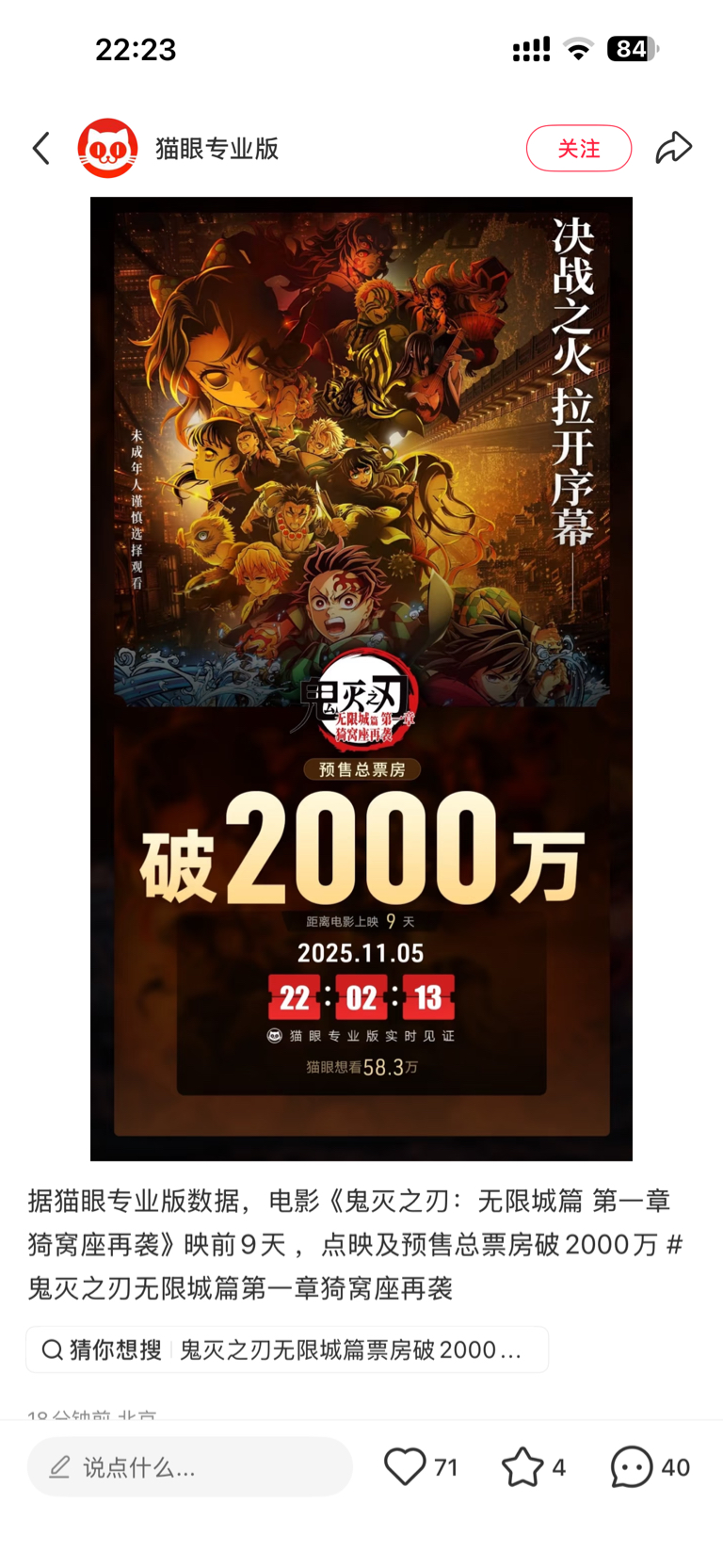 $光线传媒(SZ300251)$ $猫眼娱乐(HK|01896)$ $中国电影(SH600977)$ 鬼灭之刃上映,若票房大卖,直接利好猫眼,其次中影和光线,光线是因为它是猫眼大股东,目前中影率先起涨,猫眼和光线很快补涨!聪明资金可以埋伏了。