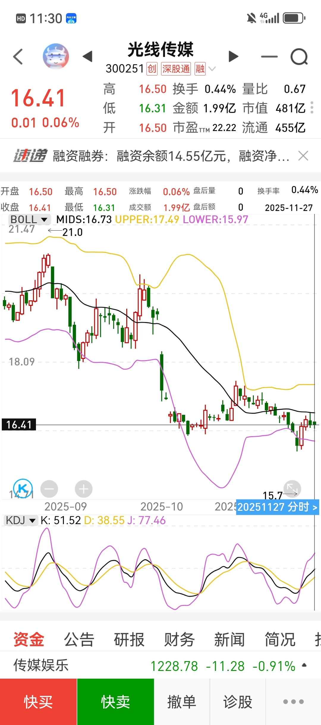 $光线传媒(SZ300251)$ 下午要大跌,诱多一早上没资金进去,早上没跌要感谢这些抄底资金没进去,不然早上就开始跌了,日线kdj到顶了股价没涨,等于指数上去了,股价没涨。外盘大于内盘股价没涨,诱多出货,下午考研下方支撑吧