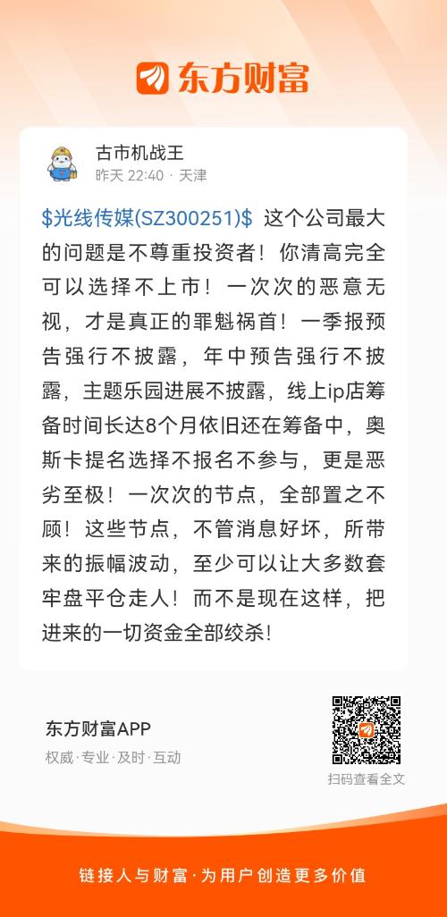 $光线传媒(SZ300251)$ 这个公司最大的问题是不尊重投资者!你清高完全可以选择不上市!一次次的恶意无视,才是真正的罪魁祸首!一季报预告强行不披露,年中预告强行不披露,主题乐园进展不披露,线上ip店筹备时间长达8个月依旧还在筹备中,奥斯卡提名选择不报名不参与,更是恶劣至极!一次次的节点,全部置之不顾!这些节点,不管消息好坏,所带来的振幅波动,至少可以让大多数套牢盘平仓走人!而不是现在这样,把进来的一切资金全部绞杀!