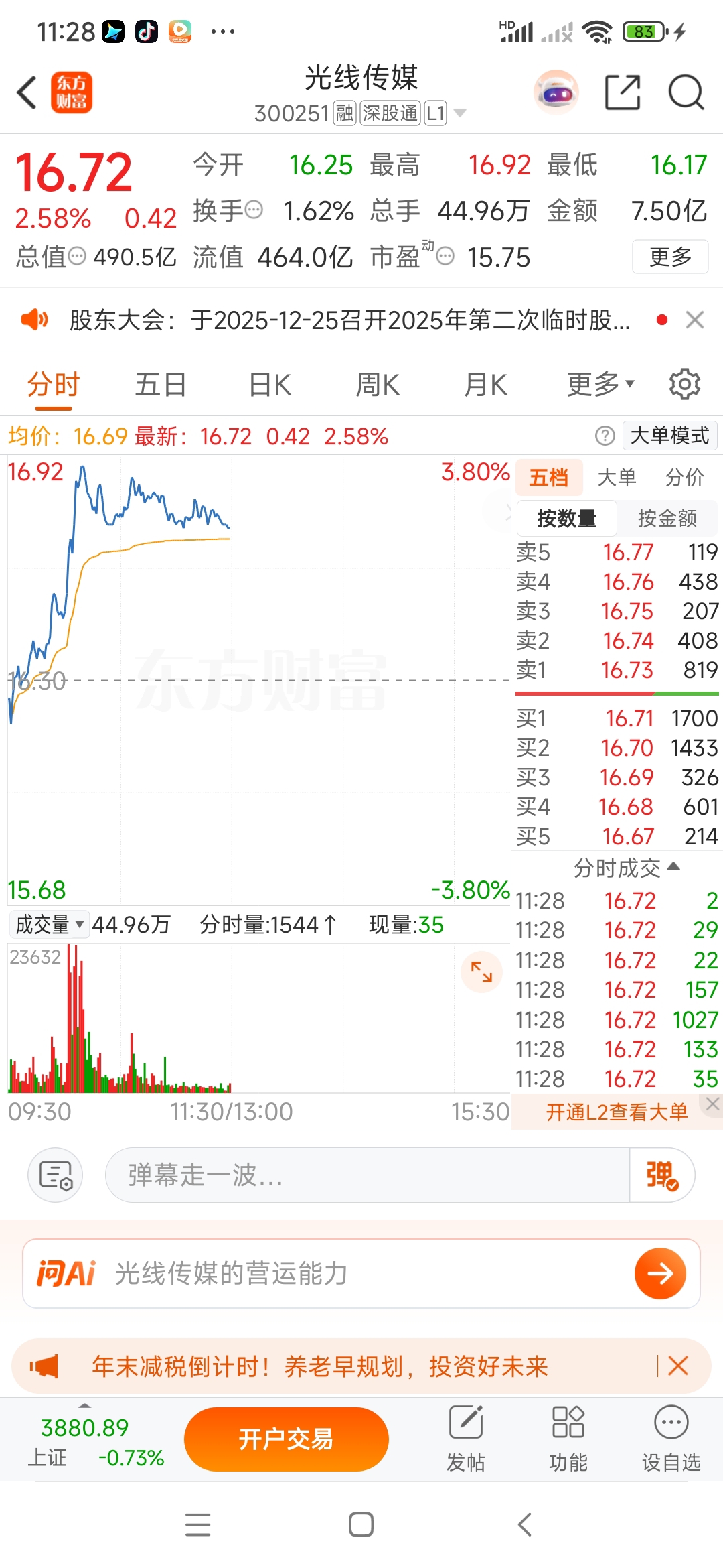 $光线传媒(SZ300251)$ 下午开始跳水!收盘必到16.50.拭目以待!