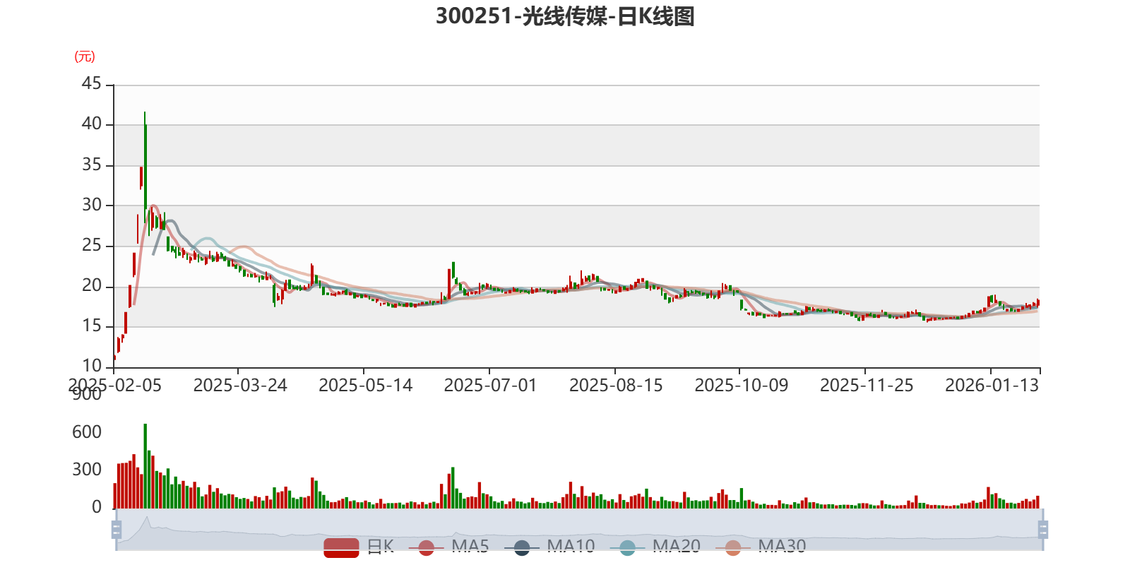 中证智能财讯光线传媒(300251)1月29日晚间披露2025年度业绩预告,预计2025年归母净利润15亿元至19亿元,同比增长413.67%-550.65%;扣非净利润预计14.24亿元至18.24亿元,同比增长483.25%-647.09%。以1月29日收盘价计算,光线传媒目前市盈率(TTM)约为28.19倍-35.71倍,市净率(LF)约4.98倍,市销率(TTM)约14.25倍。