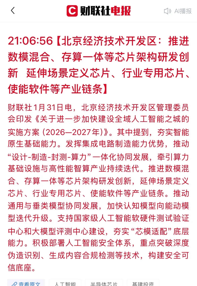 今日,北京经济技术开发区管委会印发了《关于进一步加快建设全域人工智能之城的实施方案(2026—2027年)》。为AI底层硬件与算力产业链注入强劲政策动力。方案核心在于夯实“智能原生”基础,瞄准芯片与算力进行重点突破。