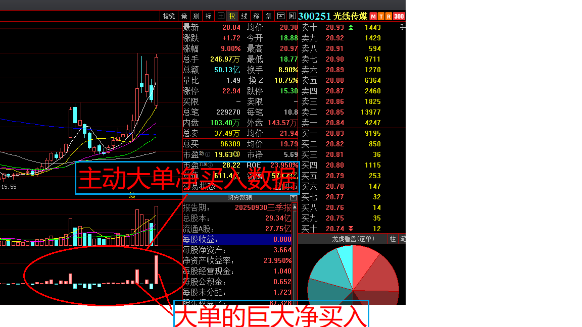 光线传媒今日主动大单净买入数据图(截止收盘),供各位大佬研究。图中左下角即主力数