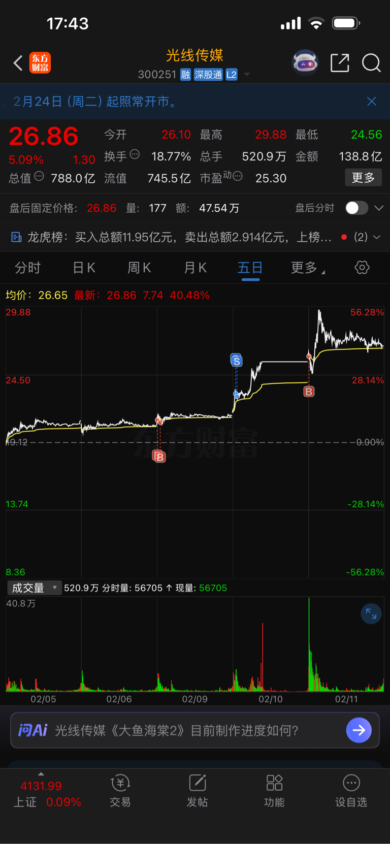 $光线传媒(SZ300251)$ 昨天 7 个点就跑路了,今天又接回来,不晓得明天有没有冲高的机会,今天承接还算可以