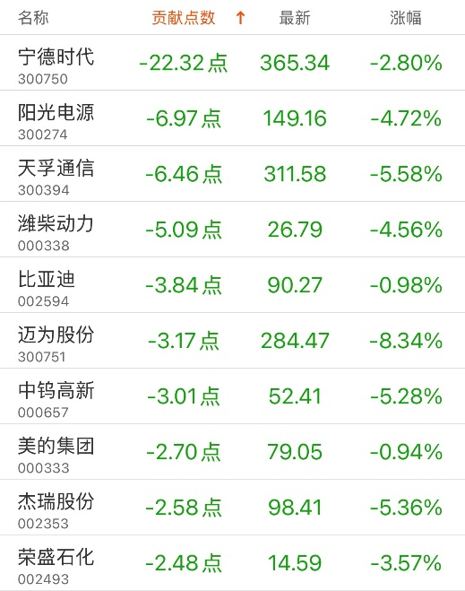 对深证成指贡献点数最多的个股是光线传媒,贡献5.87点,该股当日涨15.39%,收盘价27.22元;拖累点数最多的个股是宁德时代,拖累22.32点,该股当日跌2.8%,收盘价365.34元。