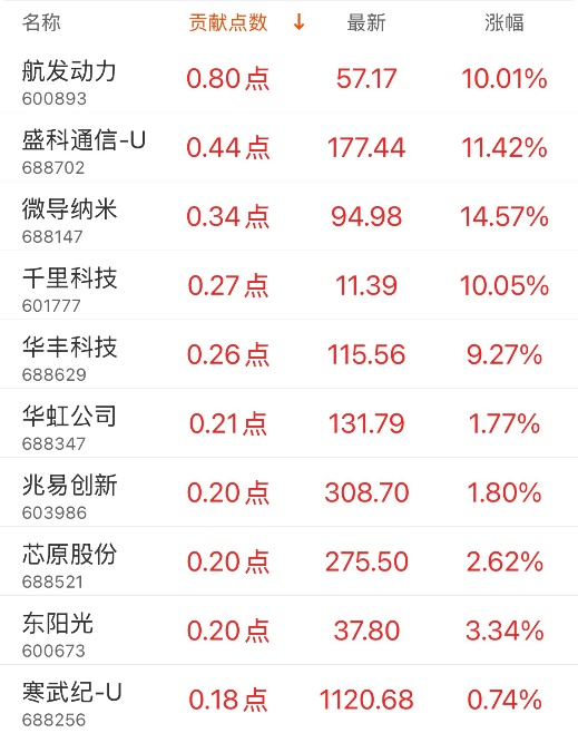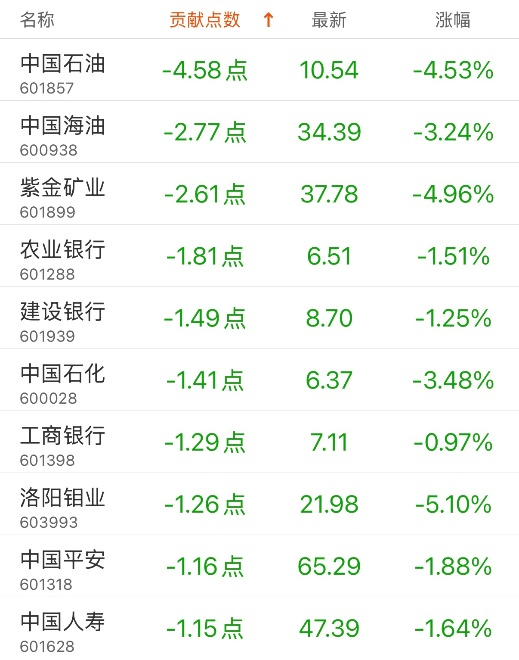对上证指数贡献点数最多的个股是航发动力,贡献0.8点,该股当日涨10.01%,收盘价57.17元;拖累点数最多的个股是中国石油,拖累4.58点,该股当日跌4.53%,收盘价10.54元。