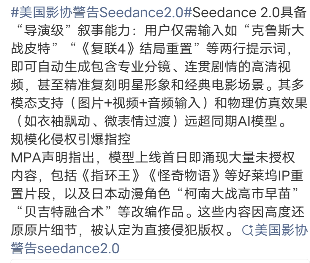 $光线传媒(SZ300251)$ 大利好,影视公司拥有版权美国电影协会谴责字节跳动新模型Seedance 2.0引发“大规模侵权”