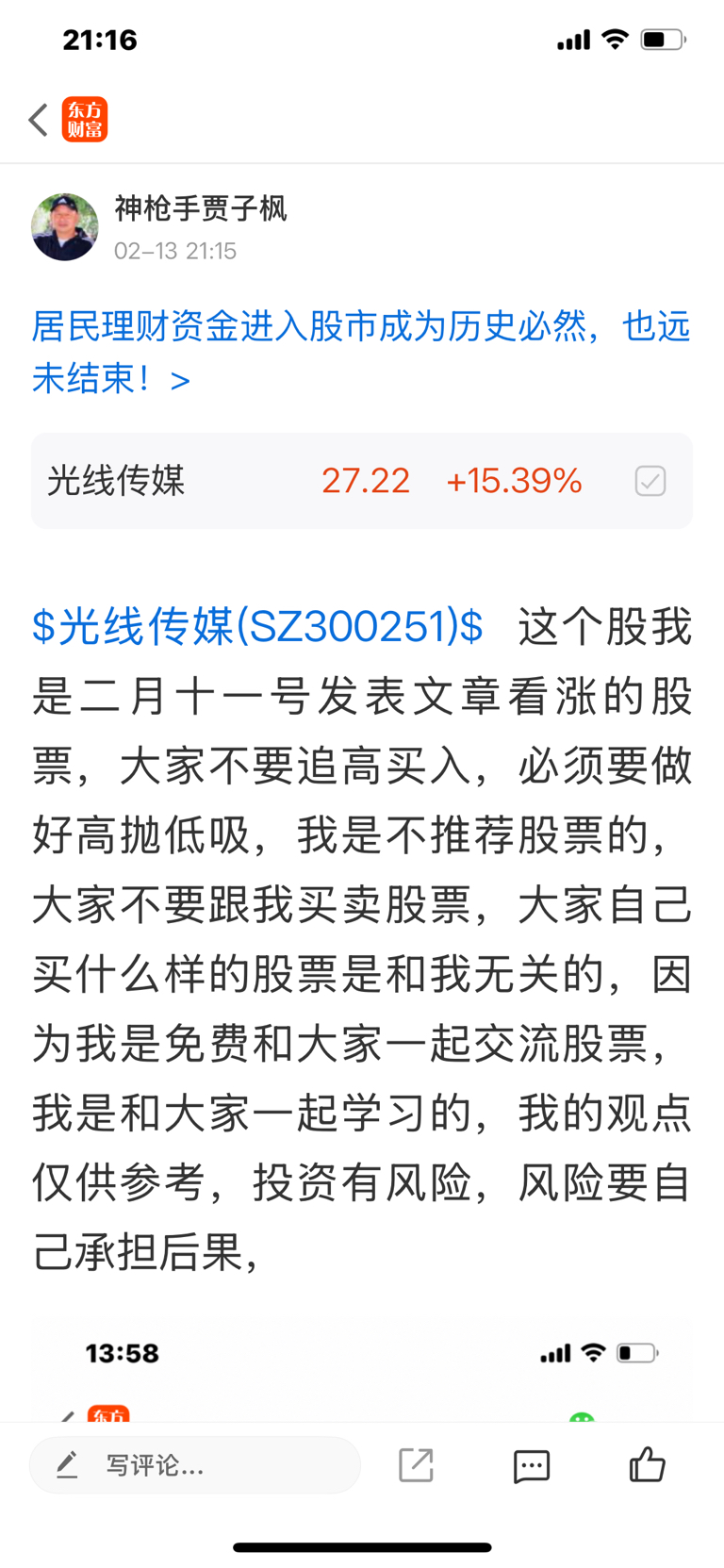 $光线传媒(SZ300251)$ 这个股是震荡上涨的股票,我是二月十一号发表文章看涨的股票,大家不要追高买入,必须要做好高抛低吸,我是不推荐股票的,大家不要跟我买卖股票,大家自己灵什么样的股票是否和我无关的,因为我是免费和大家一起交流股票,我是和大家一起学习的,我的观点仅供参考,投资有风险,风险要自己承担后果,