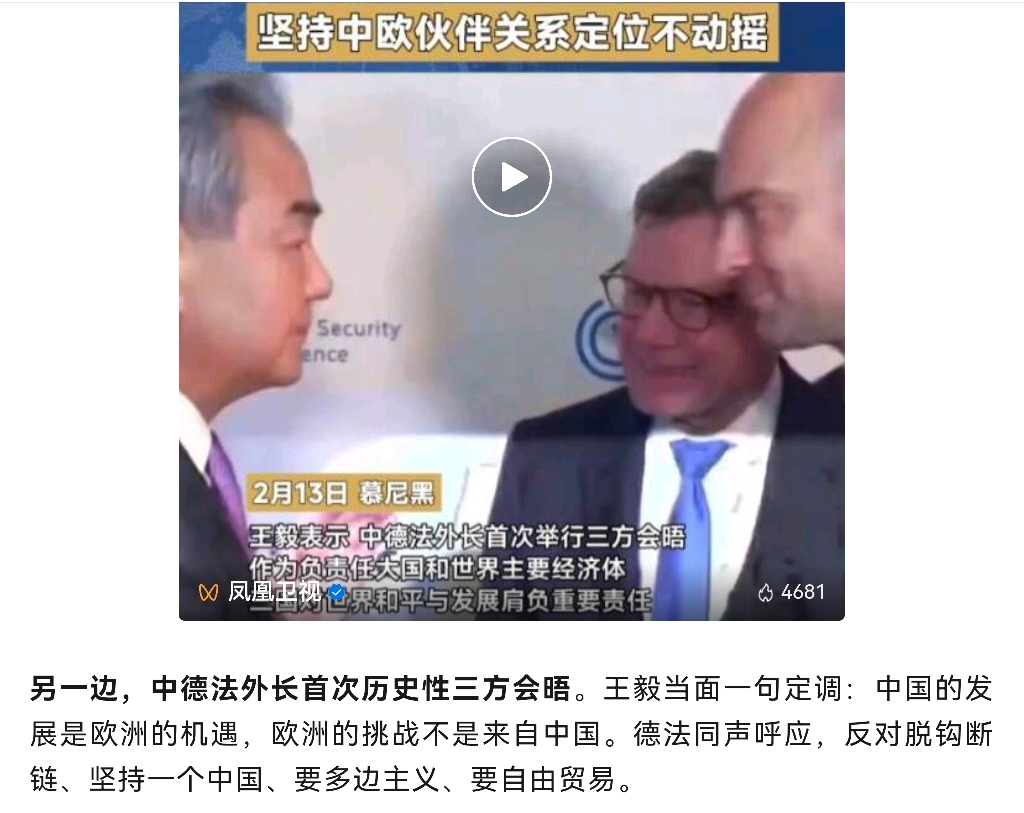 - 德法领衔:拒绝外部强加安全模式,推进欧洲军与战略自主,公开表态中欧是伙伴、不是对手。