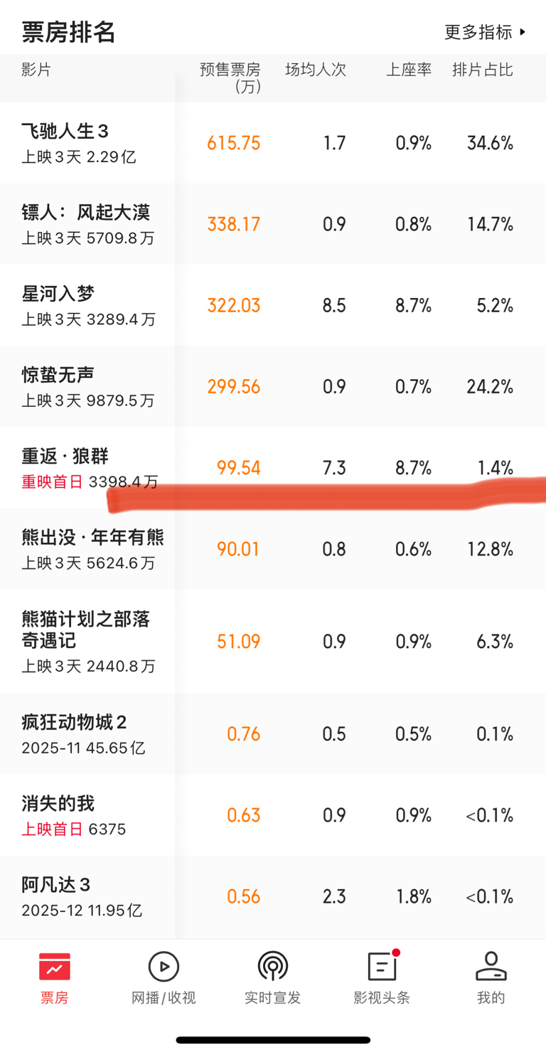$光线传媒(SZ300251)$ 光线主控的是重返狼群,其他三部光线投资比例很小。重返狼群这个排片比例倒像是羊入狼群,所以不要再吵吵票房了,光线本轮上涨的核心逻辑根本不是春节档票房预期