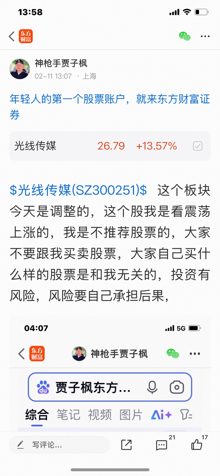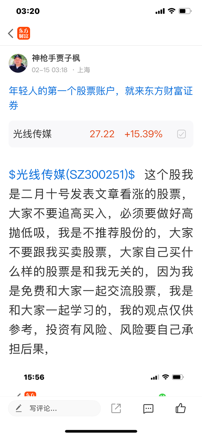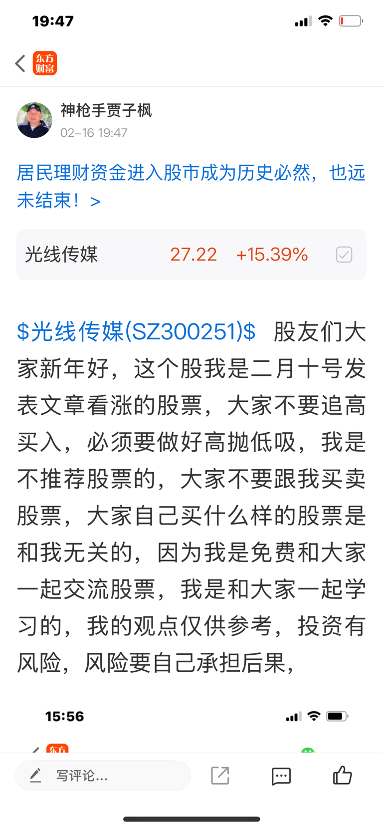 $光线传媒(SZ300251)$ 股友们大家新年好,这个股我是二月十号发表文章看涨的股票,大家不要追高买入,必须要做好高抛低吸,会做T的人是一样的很好,我是不推荐股票的,大家不要跟我买卖股票,大家自己买什么样的股票是和我无关的,因为我是免费和大家一起交流股票,我是和大家一起学习的,我的观点仅供参考,投资有风险,风险要自己承担后果,