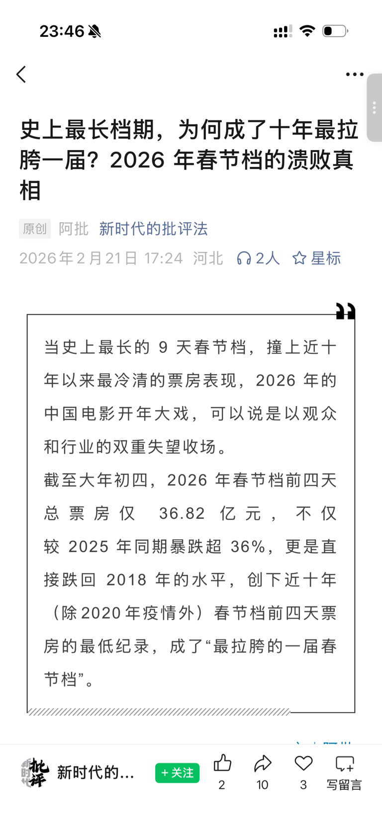 春节档票房创历史新低,其中飞驰人生3预测票房超50亿,目前20亿出头,远低于预期