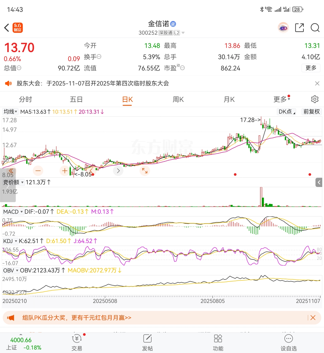 $金信诺(SZ300252)$ 当跌不跌后市看涨