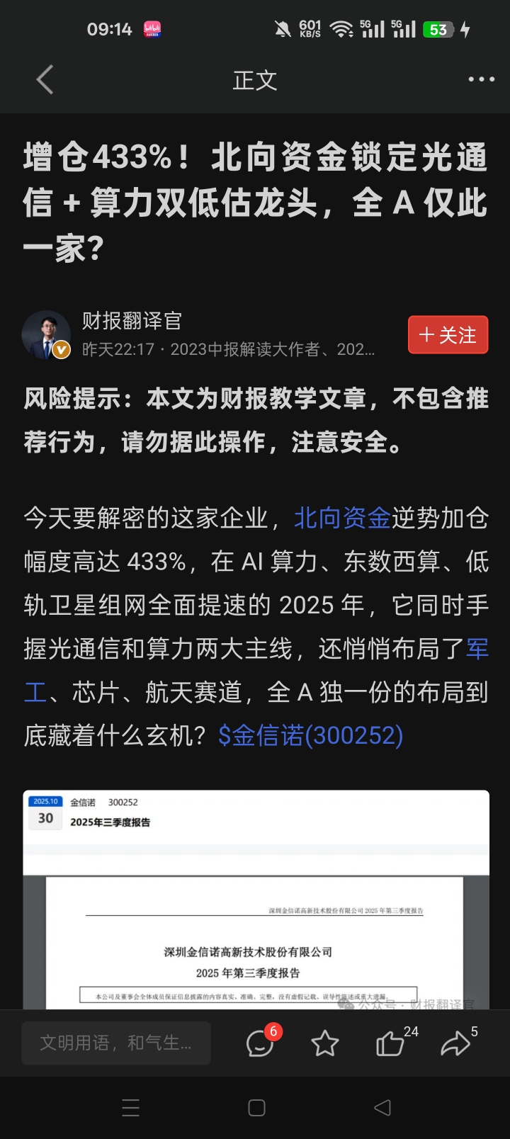 $金信诺(SZ300252)$ 财报翻译官在各个网站发这样的小作文,是无利不起早。金信诺本来就没涨起来,谈不上高位套牢割韭菜。金信诺上周五集合竞价,先在股市上积累人气,然后董秘发公告,然后就是到处都是小作文,这可能是给人气加热,然后就有异动了,即使明天金信诺砸盘,也会有人接盘。行情会有异动的。