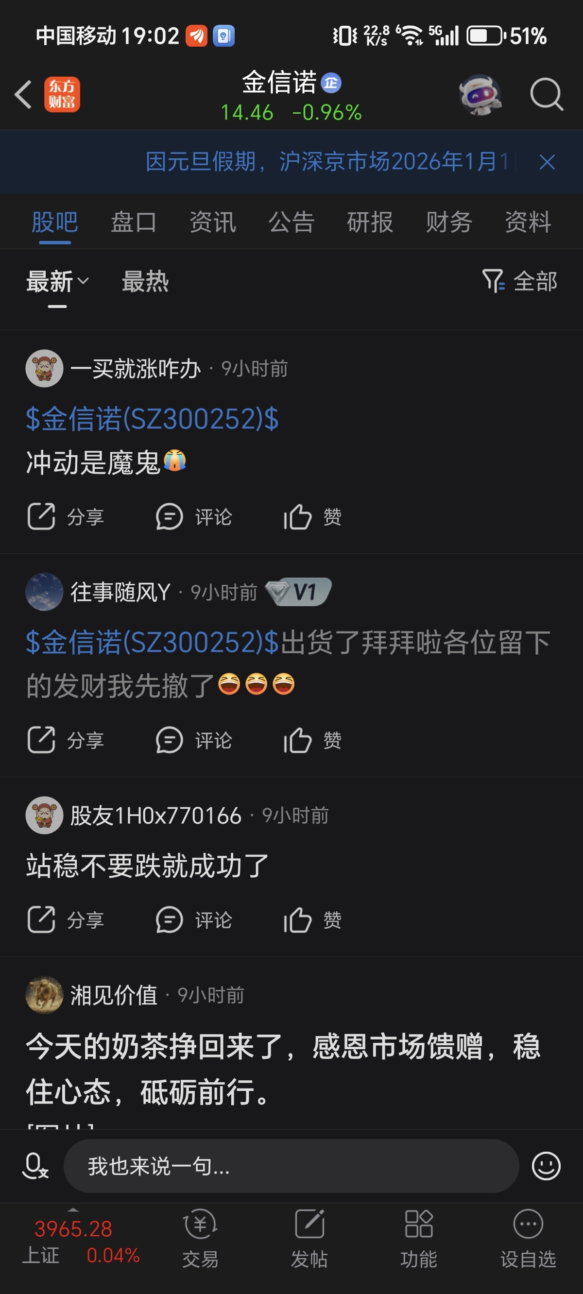 温馨提示: 1.根据《证券法》规定,禁止编造、传播虚假信息或者误导性信息,扰乱证券市场;2.用户在本社区发表的所有资料、言论等仅代表个人观点,与本网站立场无关,不对您构成任何投资建议。用户应基于自己的独立判断,自行决定证券投资并承担相应风险。《东方财富社区管理规定》
