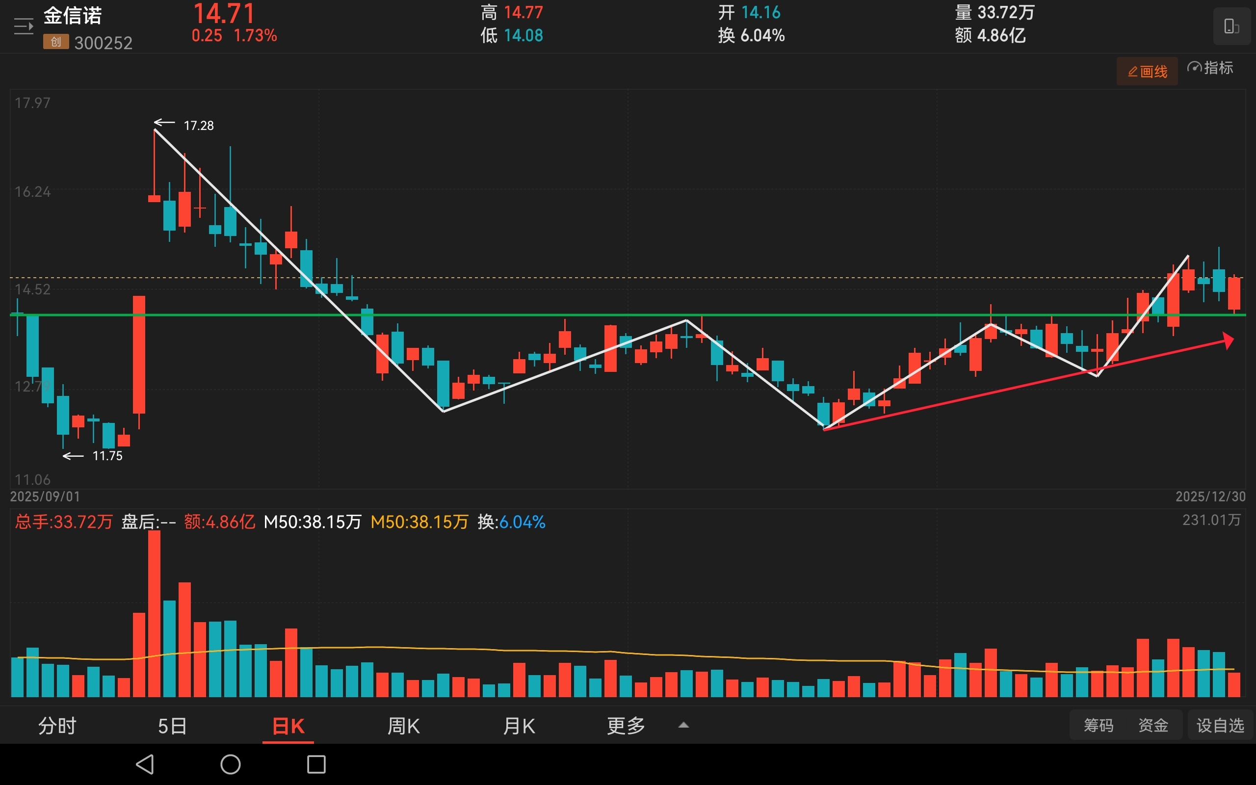 $金信诺(SZ300252)$ 上周五卖飞了昊志机电,吃一堑长一智。金信诺回踩支撑,商业航天出现分歧希望后排的能顶上