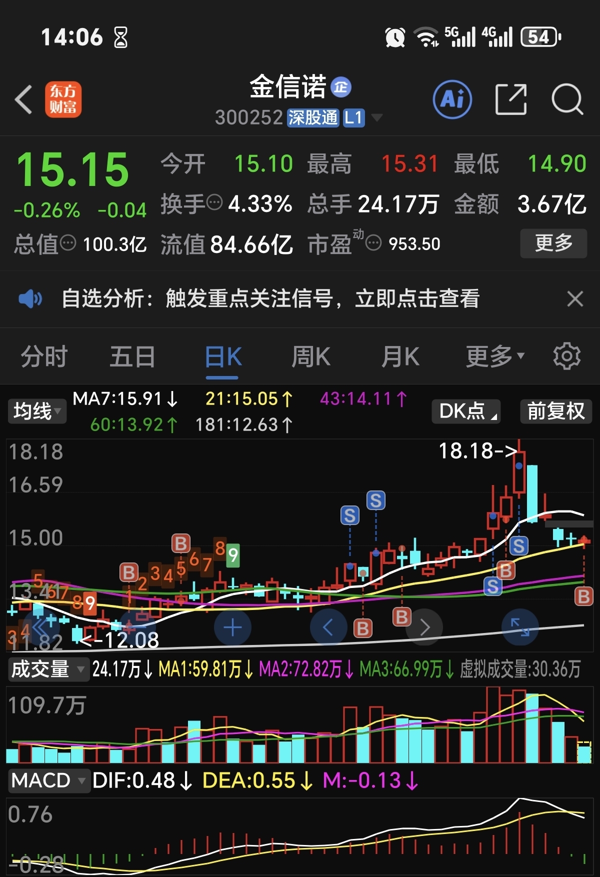 $金信诺(SZ300252)$ 刚才看到小金在这个位置有点筹码松动,小试牛刀买了少量底仓,因为想博一下60分钟的缺口在大市企稳的情况下补了60分钟缺口,但如果明天不补的话或者放弃今天的操作,先少量观察一下吧。