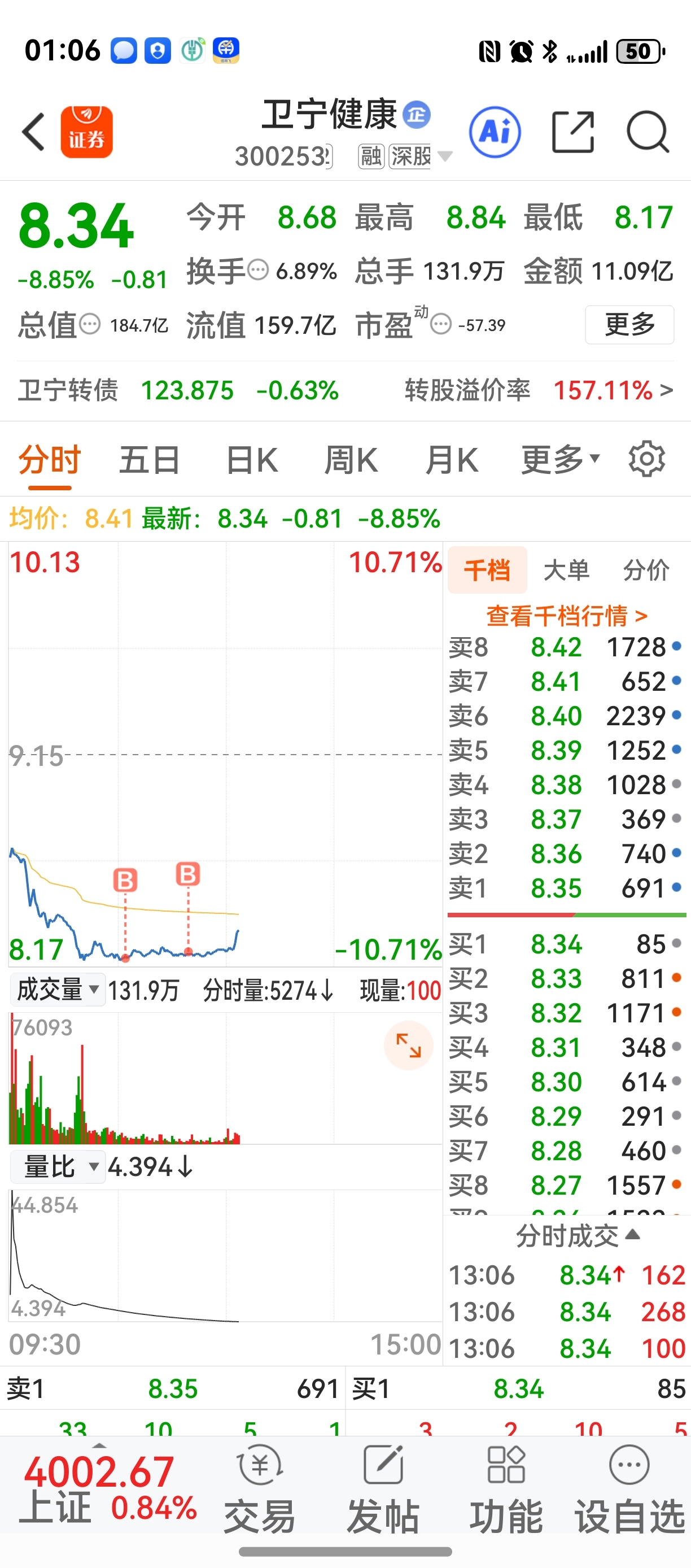 $卫宁健康(SZ300253)$ 哈哈不用看了,今天收盘价就在840上下3分!