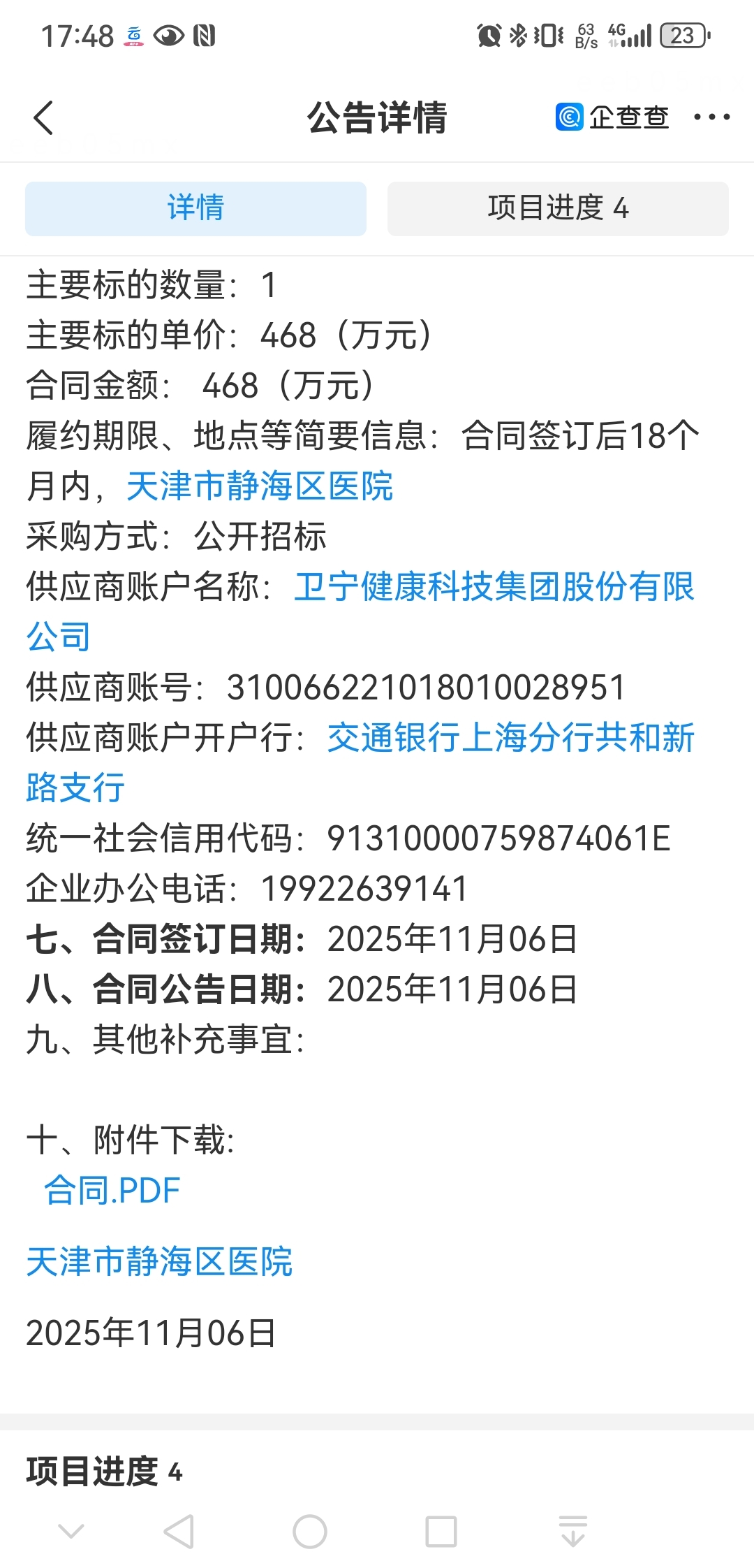 $卫宁健康(SZ300253)$ 虽然实控人涉及案件,由此可能终审会被罚被拘,但是中标的项目依旧源源不断,这是今天刚中标的项目。这说明什么?我不知道,大家细品。