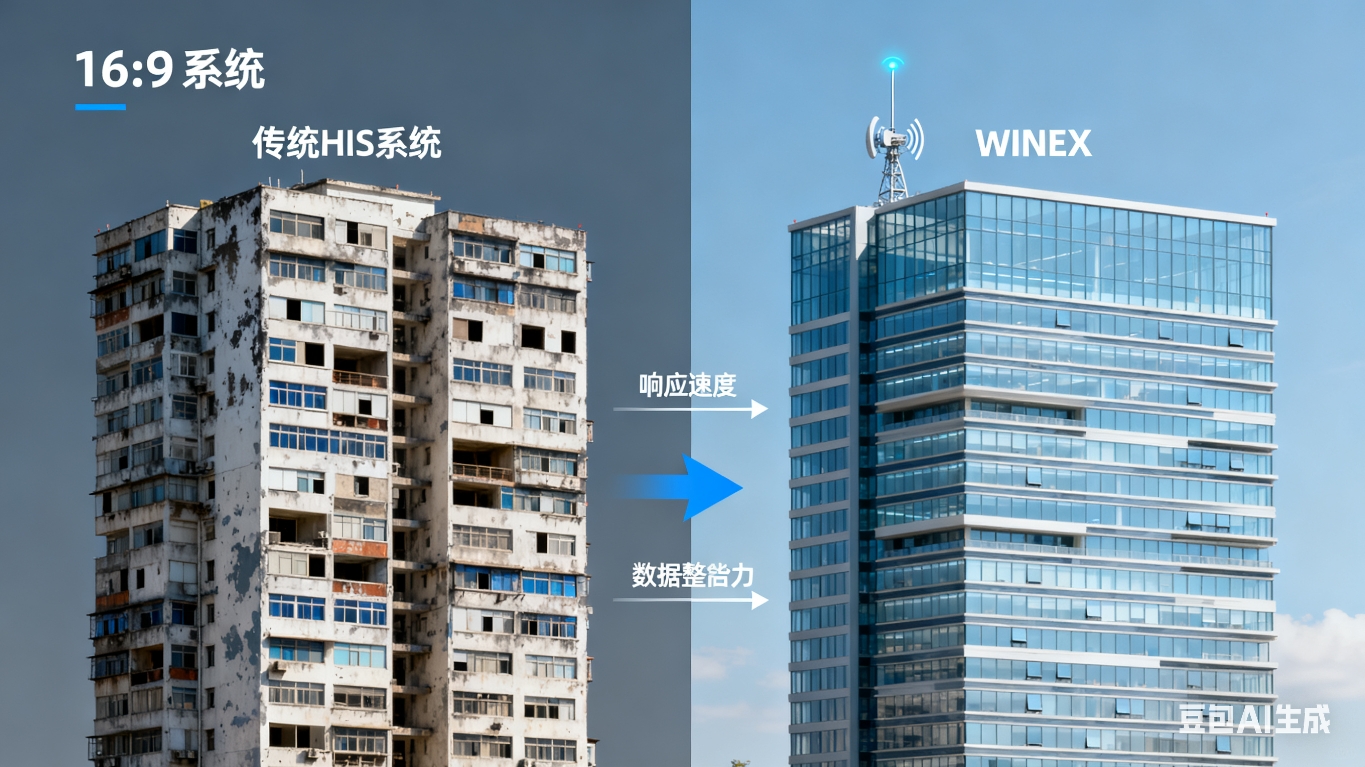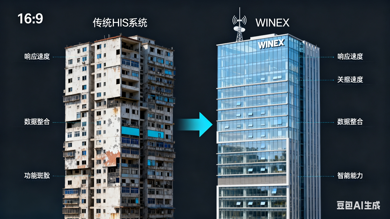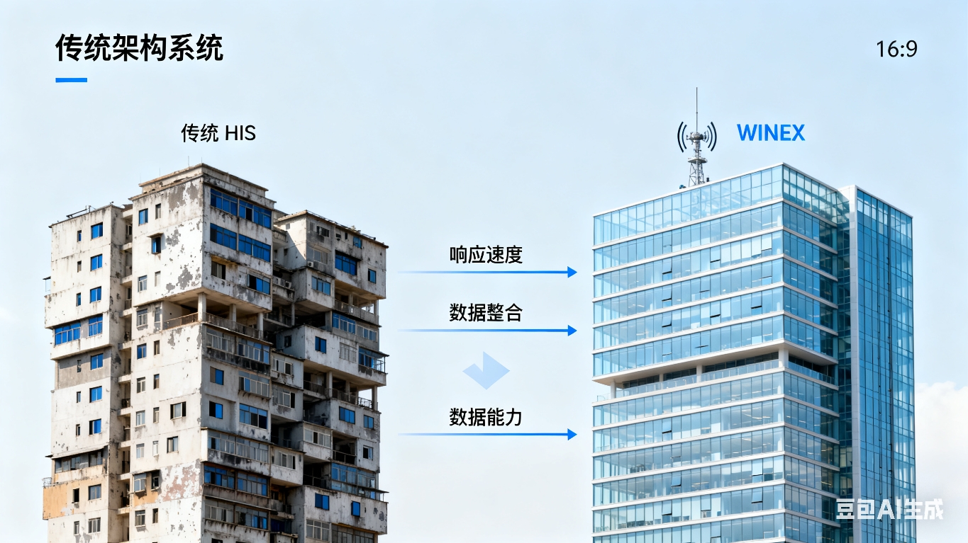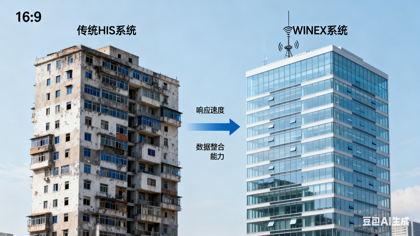 我跟豆包说:画一张医院信息化传统HIS系统跟WINEX系统对比图,采用高楼的形式