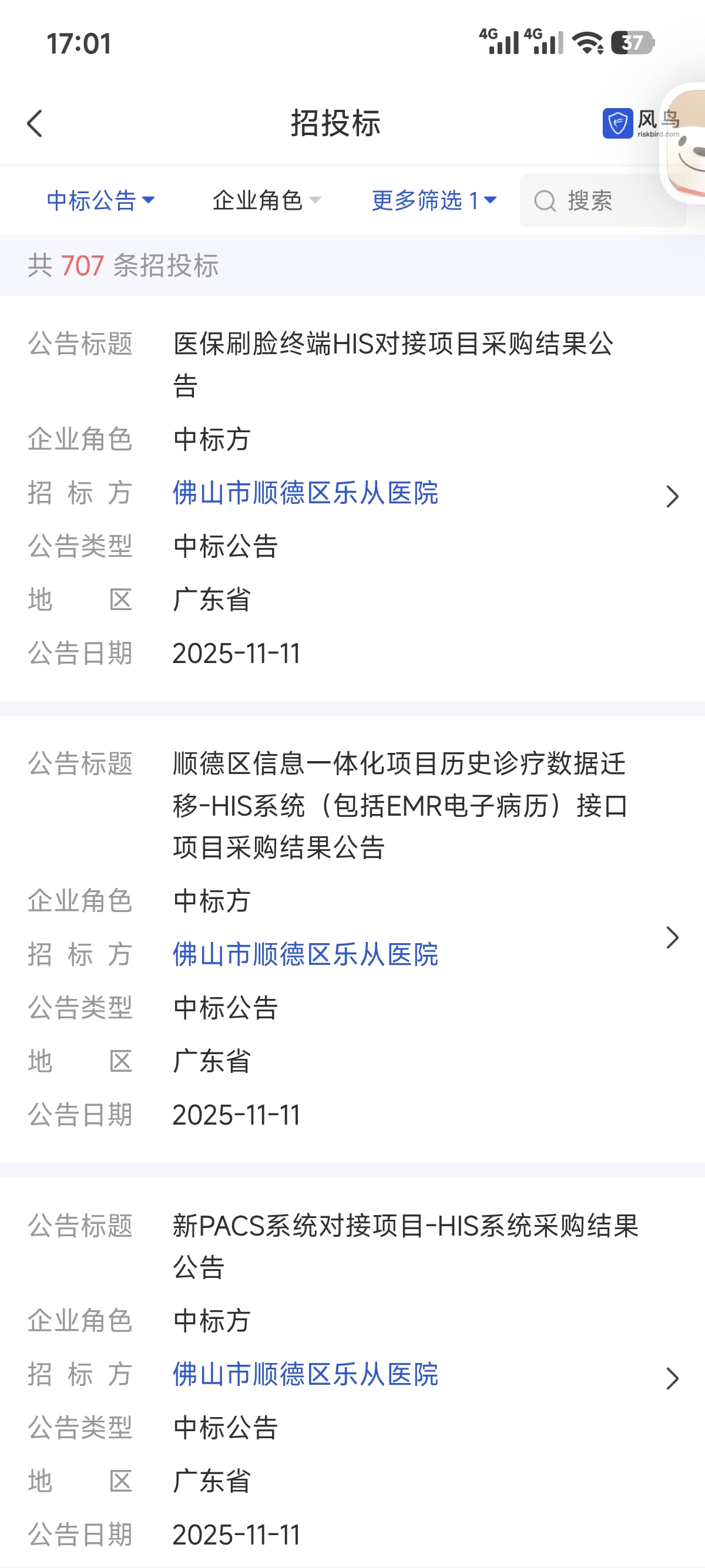 $卫宁健康(SZ300253)$ 今日同一家医院有3个中标公告,合同金额共计28.46万元