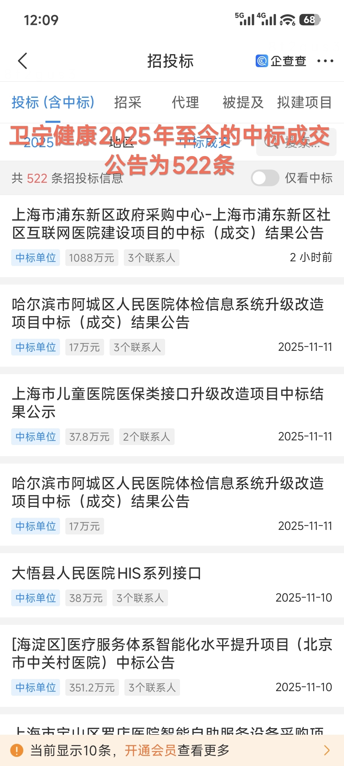 $卫宁健康(SZ300253)$ 查了一下2025年至今的几家主要核心诊疗系统厂商的中标成交公告,卫宁健康的市场份额和行业集中度依然很高