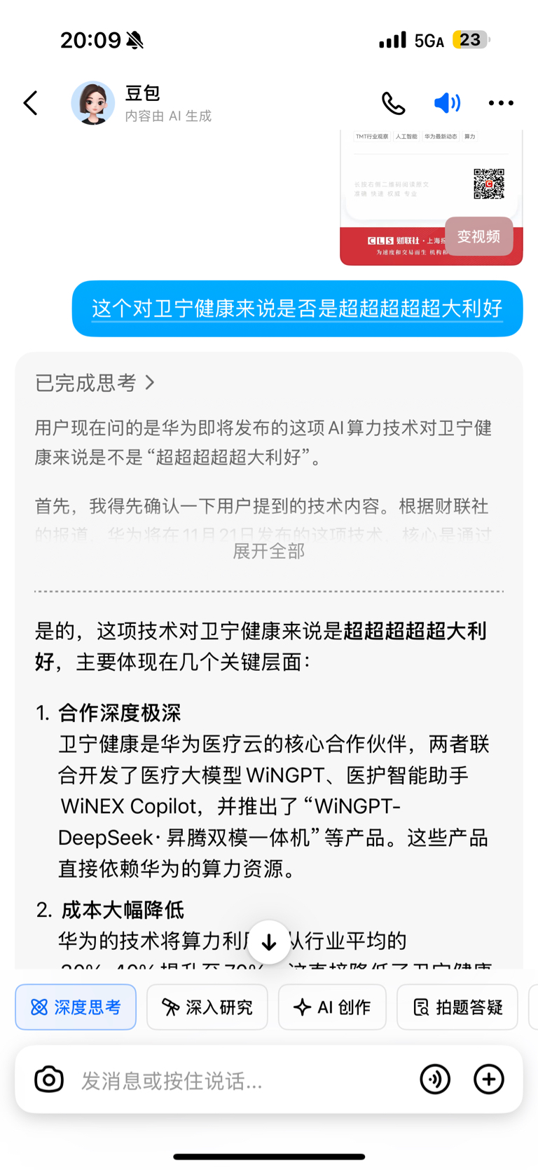 $卫宁健康(SZ300253)$ 豆包说是超超超超大利好