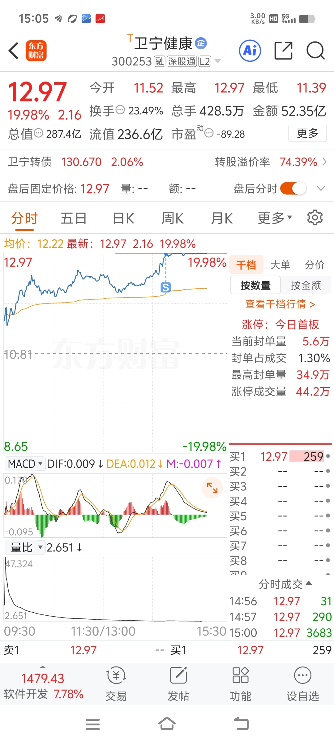 $卫宁健康(SZ300253)$ 一早挂的单,没想到梦想成真,恭喜大哥成功封板!恭祝大哥年年有今日岁岁有今朝!