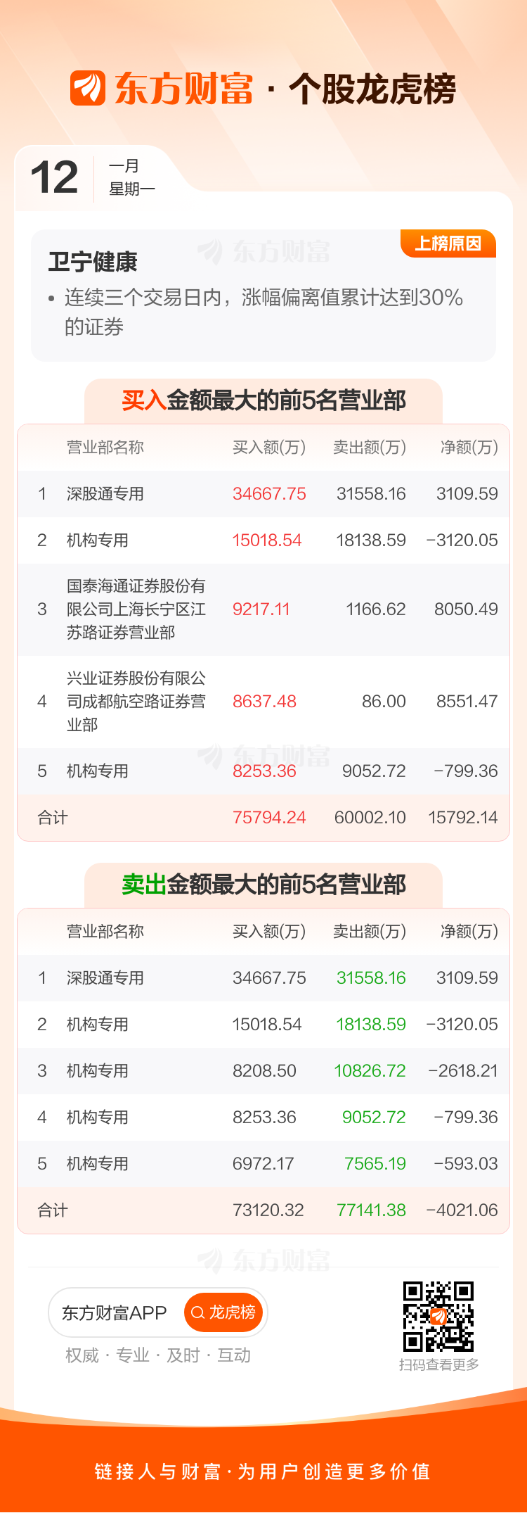 交易所2026年1月12日公布的交易公开信息显示,卫宁健康因成为连续三个交易日内,涨幅偏离值累计达到30%的证券上榜。卫宁健康当日收报12.97元,涨跌幅19.98%,换手率23.49%,成交额52.35亿。异常期间1月9日至1月12日,期间涨幅36.53%,累计偏离值32.23%,区间成交额87.63亿。