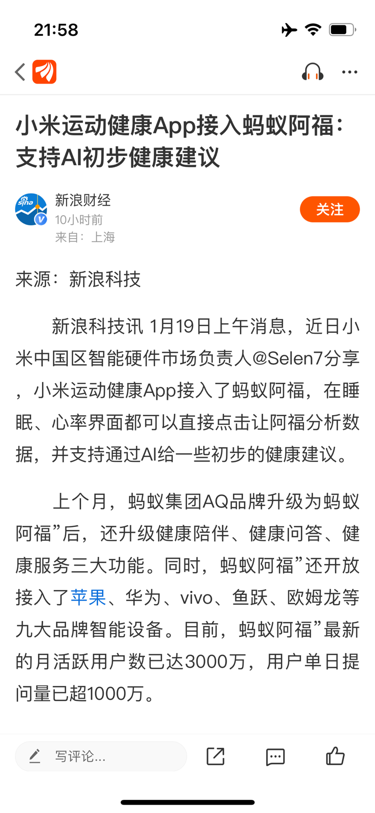小米运动健康App接入蚂蚁阿福:支持AI初步健康建议