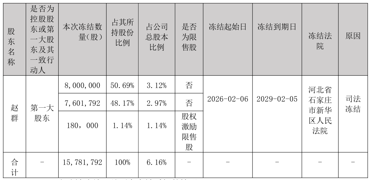 根据民事裁定书,赵群所持公司股份被司法冻结系因曹希同向石家庄新华区人民法院提起的诉前保全,法院裁定的冻结金额为5000万元。