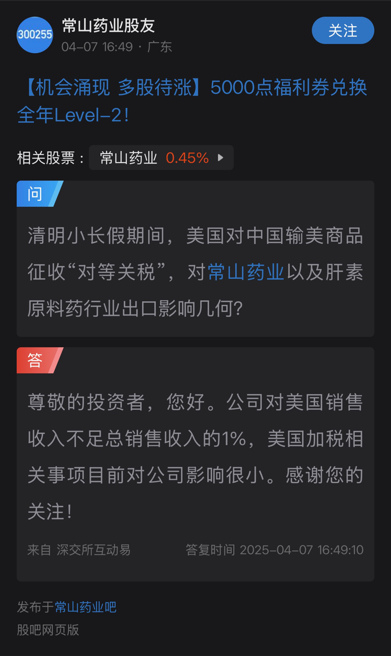 $常山药业(SZ300255)$ 美国加关税跟常山没有啥关系,上次4月7日,董秘就回答过了